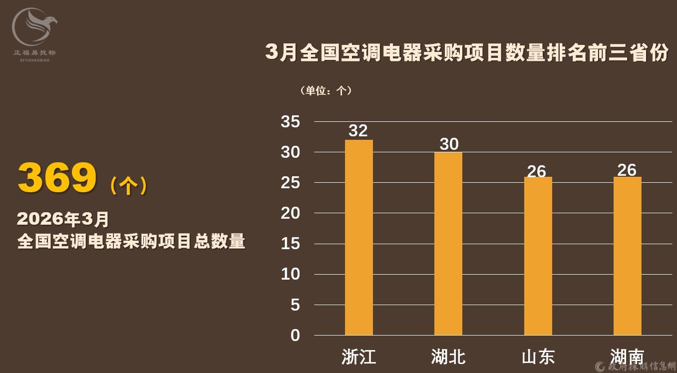 从各省份空调电器采购项目数量来看,3月,全国空调电器采购项目数量有369个。其中,浙江空调电器采购项目数量共32个,排名第一;湖北空调电器采购项目数量共30个,排名第二;山东和湖南空调电器采购项目数量均为26个,并列第三。详情》